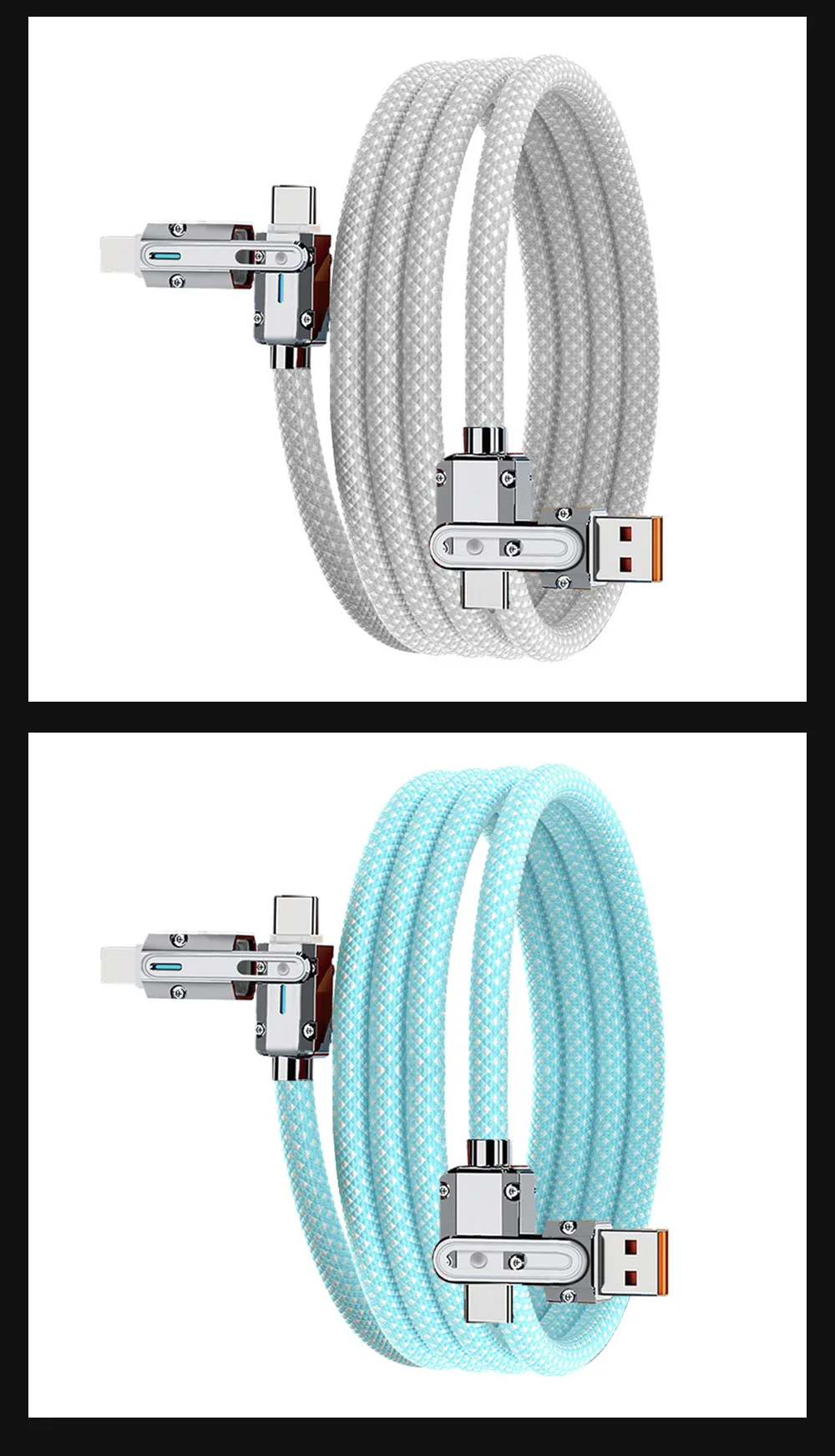 Das 4-in-1 Ladekabel bietet eine praktische Lösung für all Ihre Ladebedürfnisse. Geeignet für Android- und iOS-Geräte, mit einer schnellen Ladeleistung von bis zu 65 W. Das aufgerollte Design minimiert Kabelsalat und macht es ideal für unterwegs.