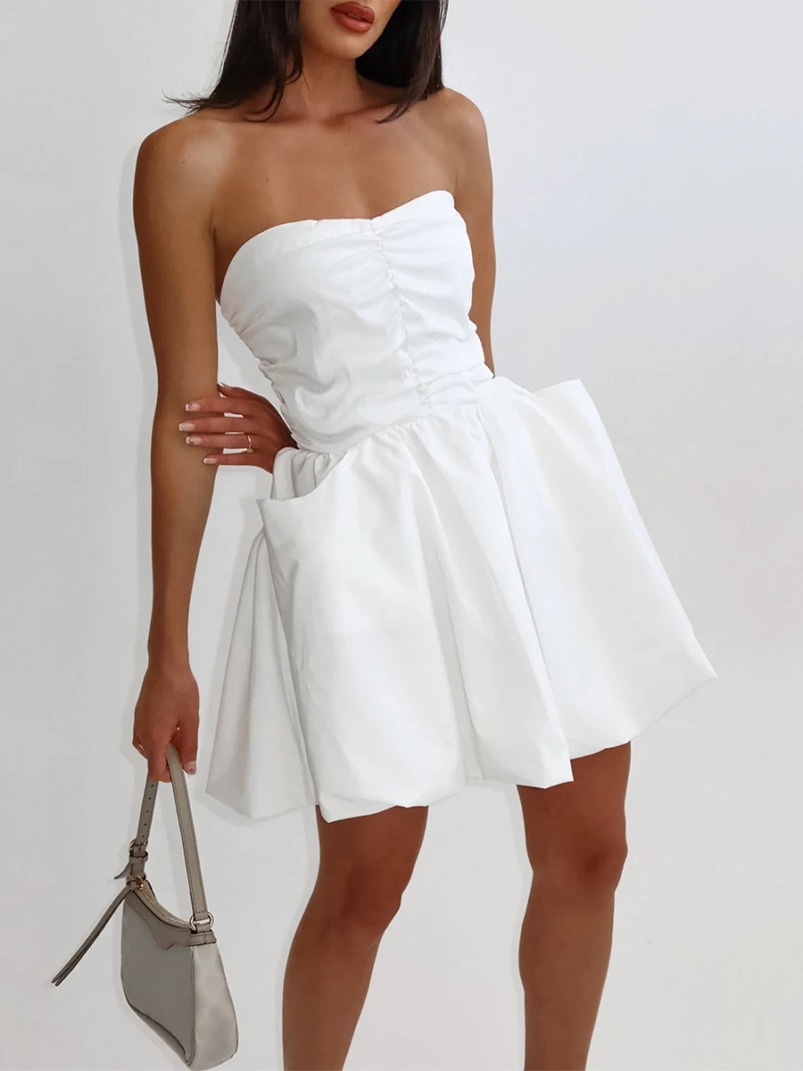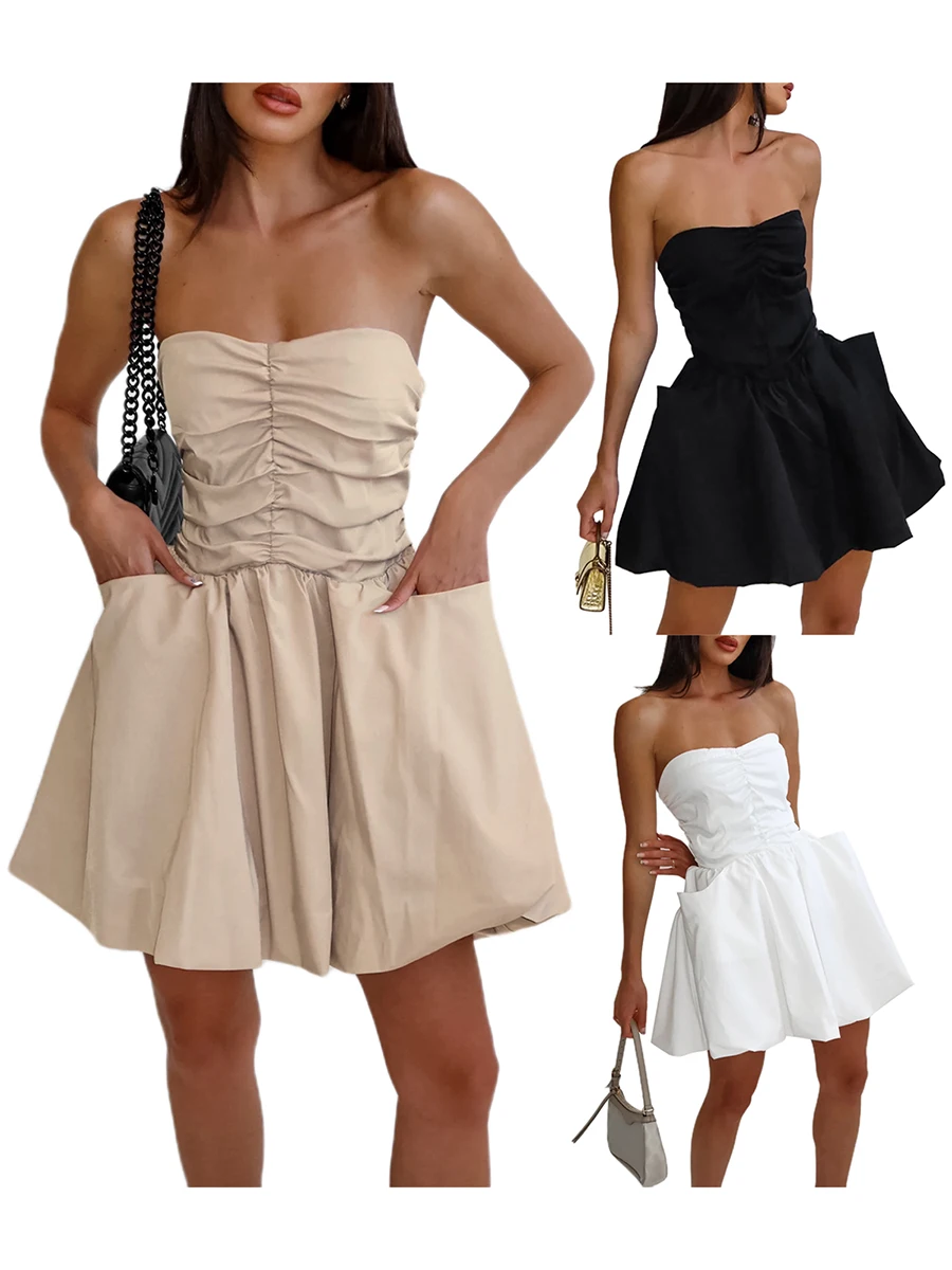 Damen Sommer Mini Kleid, Trägerlos, Rüschen vorne, Einfarbiges Bustier Top, Kurzes Kleid mit Taschen. Ein absolut schönes Geschenk für Ihre Familie, Freunde oder sogar für sich selbst. Hand-/Maschinenwäsche und zum Trocknen aufhängen. Nicht bleichen.