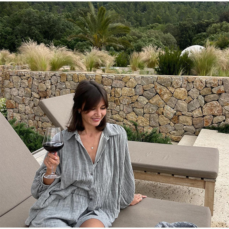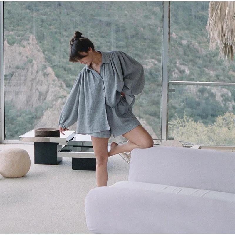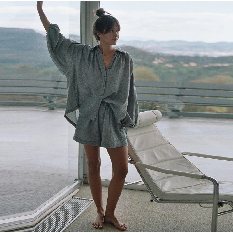 Poczuj niezwykłą miękkość i swobodną elegancję dzięki temu dwuczęściowemu zestawowi loungewear dla kobiet. Przewiewna koszula z szerokimi rękawami i dopasowane szorty tworzą idealny strój na leniwe dni w domu, letnie spacery czy stylowy wakacyjny look.