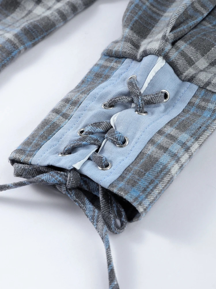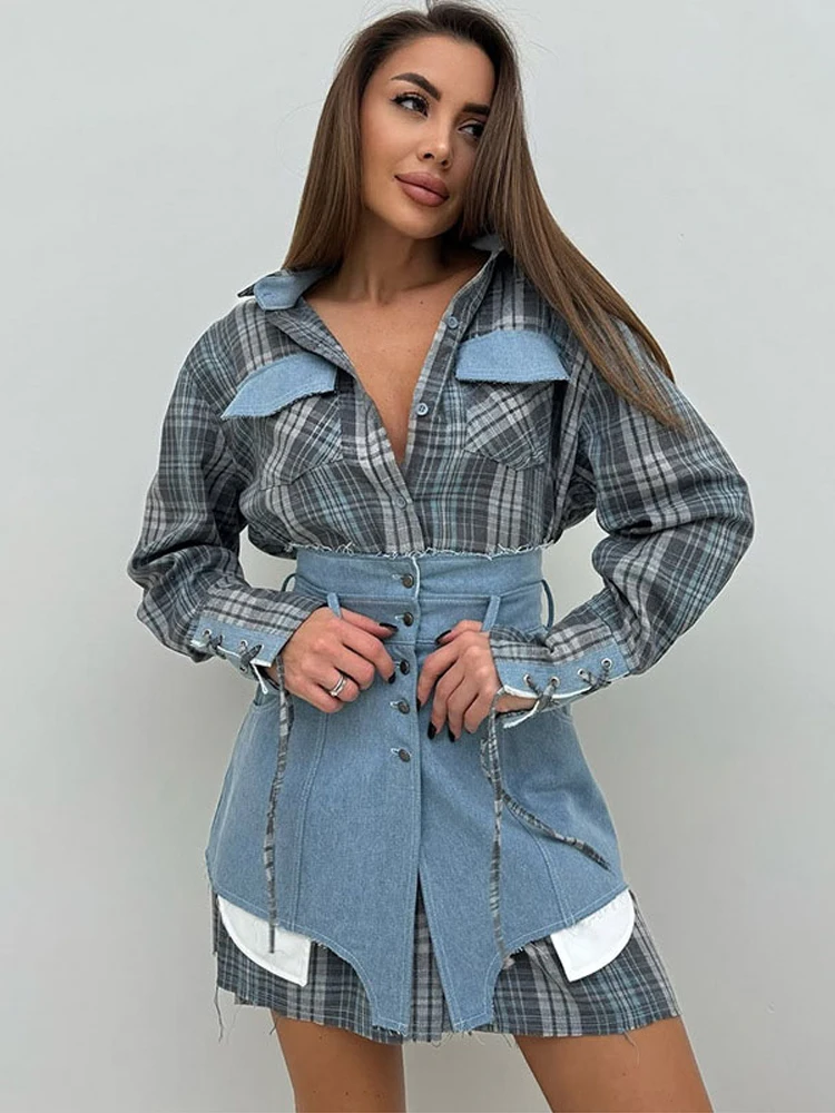 Zaskakujące połączenie koszuli w kratę z dżinsową spódnicą łączy różne style w jedną przyciągającą wzrok stylizację. Dzięki temu z łatwością stajesz się centrum uwagi w świecie mody. -