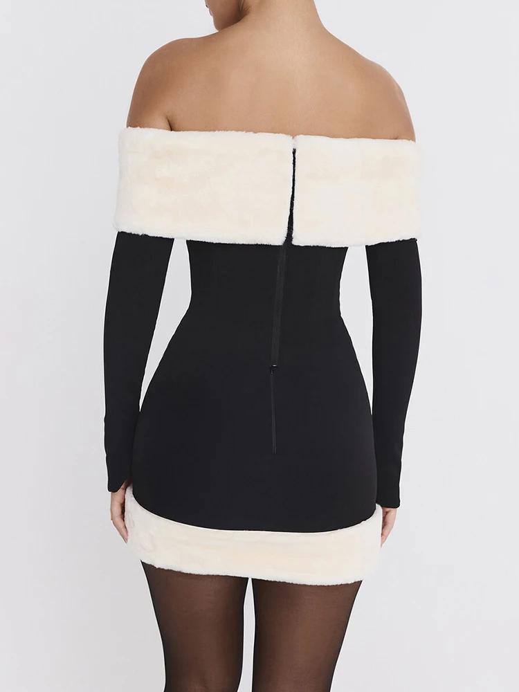 Stilvolles Mini-Kleid mit gewagtem Rückenausschnitt und luxuriösen Pelz-Details. Die kontrastierenden Farben und die figurbetonte Passform betonen die feminine Silhouette, während die langen Ärmel einen eleganten Touch verleihen. Perfekt für eine Abendparty oder einen besonderen Anlass!