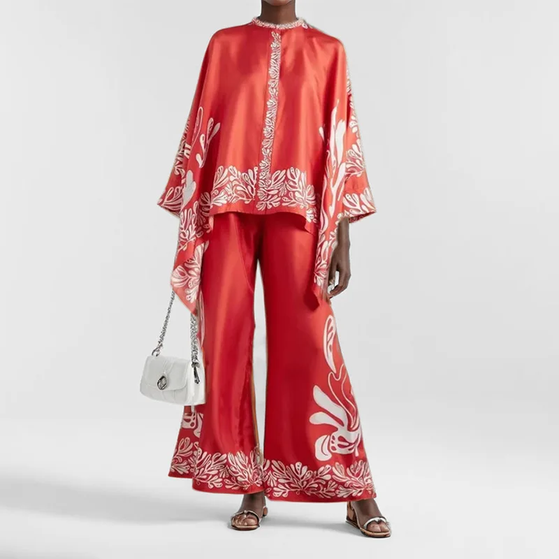 Ten dwuczęściowy zestaw to stylowe połączenie niewymuszonej elegancji i wyrazistych wzorów. Luźna bluzka o asymetrycznym kroju swobodnie układa się na sylwetce, a szerokie spodnie zapewniają maksymalny komfort i swobodę ruchów.Wykonany z lekkiego, miękkiego materiału, który przyjemnie otula skórę – idealny na letnie dni, stylowe wakacje lub wieczorne wyjście. Unikalne wzory nadają każdej stylizacji luksusowy i artystyczny charakter.Szczegóły: